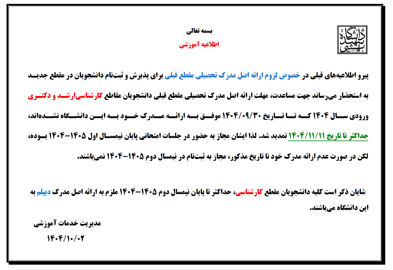 مهلت ارائه اصل مدرك كارشناسی (گواهينامه موقت يا دانشنامه) دانشجويان ورودی 1404